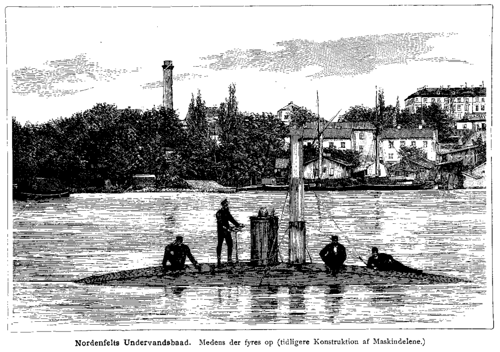 Были попытки применить для подводных лодок и паровую машину, воплотив, таким образом, ту идею, с которой еще в конце XVIII века выступал Арман Мезьер. Так, например, в 1885 году изобретатель Норденфельд построил в Стокгольме паровую подводную лодку с железным корпусам водоизмещением в 60 тонн. Лодка была вооружена пулеметом и двумя самодвижущимися минами — торпедами. Паровые котлы, питавшие машину паром, работали на угольном топливе. Мощность паровой машины достигала 100 лошадиных сил. При погружении в воду топки гасились, и машина работала за счет сжатого пара, накопленного в котлах. Таким образом, котлы представляли собой как бы паровые аккумуляторы, которые, однако, на практике оказались малопригодными: они были крайне тяжелы, громоздки, и запаса их энергии хватало ненадолго.