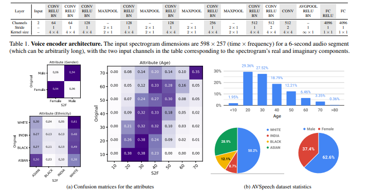 Speech2Face image reconstructions (S2F) and those obtained from the original images for gender, age, and ethnicity; the stronger diagonal