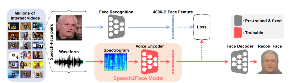 Нейросеть включает в себя два основных компонента: кодировщик голоса, который создает на базе аудиозаписи спектрограмму и выделяет релевантные признаки, и декодировщик лиц, который выстраивает изображение исходя из полученного списка характеристик. Для обучения кодировщика голоса использовалось несколько миллионов роликов с Youtube, где фигурировало около ста тысяч людей. Длина записей варьировалась; также авторы проекта включили в выборку ряд роликов, где один и тот же человек разговаривает в разных ситуациях и на разных языках с целью проверить, насколько будут различаться сгенерированные изображения.
