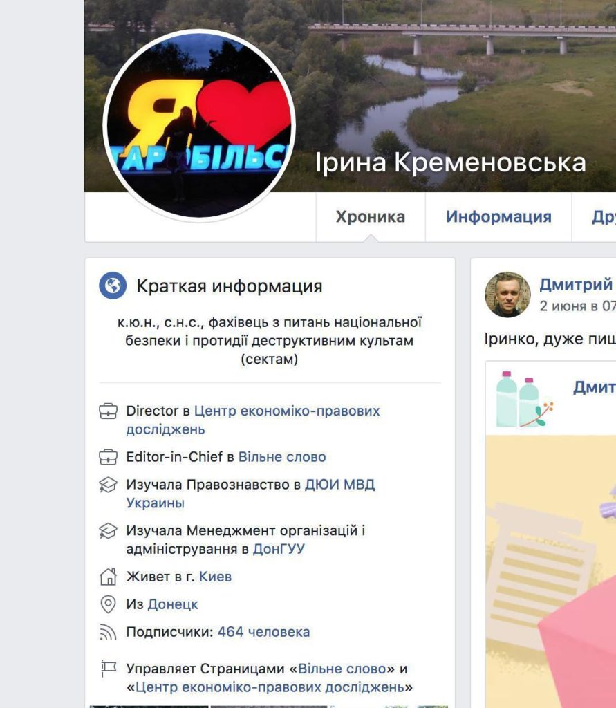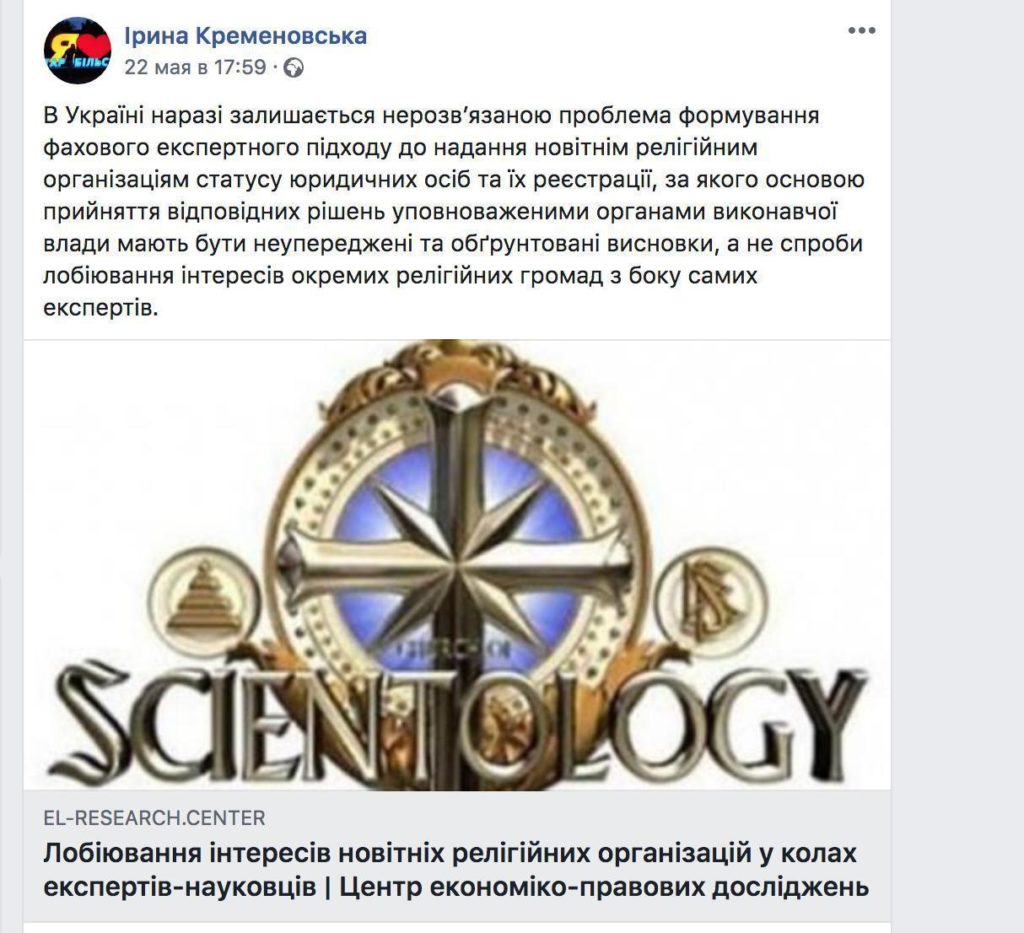 На личном профиле фейсбук, редактора газеты и руководителя организации “Институт экономико-правовых исследований” Ирины Кременовской, которая подымает проблематику потребности борьбы с культами на государственном уровне, можно прочитать, что она “фахівець з національної безпеки і протидії деструктивним культам”.
