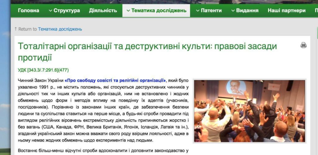 “Критерії розмежування релігійних організацій і деструктивних культів”. Ми цю статтю відправляли до Міністерства культури, бо там опікуються питанням релігій та національностей і до Верховної ради і можливо, ще до якихось структур.