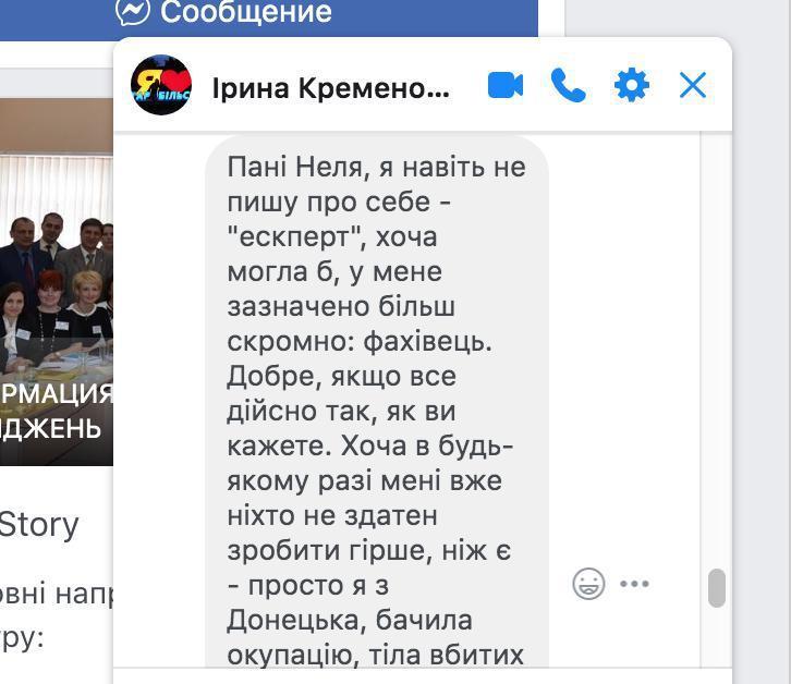 Позже, от нее пришло еще одно сообщение, в котором Ирина с эксперта по национальной безопасности сама превращается в “скромного фахівця” и абсолютно без повода начинает манипулировать военными действиями на территории Украины и использовать образы войны, выставляя себя потерпевшей жительницей разбомбленных территорий, у которой больше нет дома. Зачем она поведала людям, спросившим о ее научной деятельности эту историю и почему она так занервничала — тоже остается загадкой.