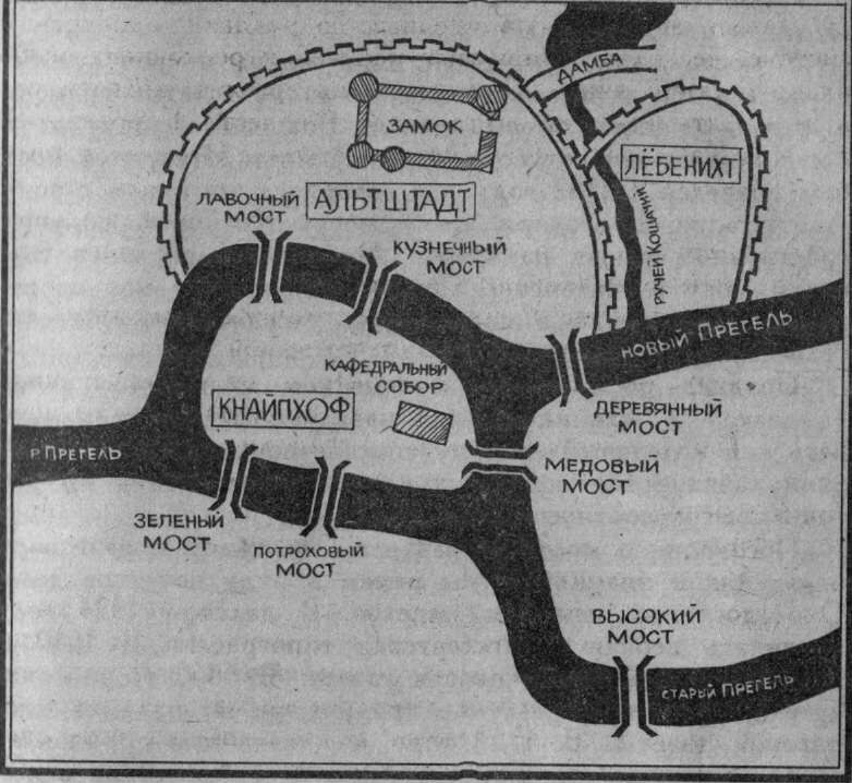Издавна среди жителей Кёнигсберга была распространена такая загадка: как пройти по всем мостам (через реку Преголя), не проходя ни по одному из них дважды. Многие кёнигсбержцы пытались решить эту задачу как теоретически, так и практически, во время прогулок. Впрочем, доказать или опровергнуть возможность существования такого маршрута никто не мог.