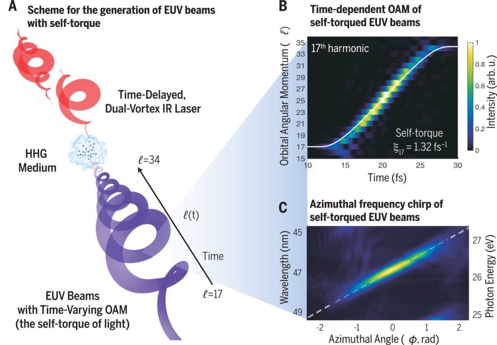 В эксперименте исследователи пропускали через облако газообразного аргона перекрывающиеся импульсы закрученного света от двух ультрафиолетовых лазеров. В результате взаимодействия на выходе из облака получался объединённый вихревой луч. Оказалось, что если импульсы имеют разный орбитальный момент и небольшую задержку относительно друг друга, то луч на выходе имеет изменяющееся со временем вращение, контролировать которое можно изменением времени задержки. Интенсивность этого луча в поперечном сечении имеет форму полумесяца.