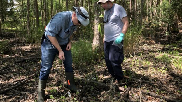 Геологи берут образцы грунта, чтобы исследовать изменения в его составе. Наличие определенных веществ может указывать на разложение тела вблизи