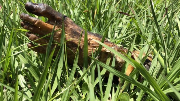 На этом поле площадью более гектара лежат 15 трупов. Все они без одежды, некоторые помещены в металлические сетки, другие покрыты синим пластиком. Несколько тел — в неглубоких ямах, но большинство просто лежат на земле под открытым небом.