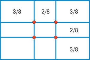 Золотое сечение — признанное мерило красоты и гармонии — было известно ещё в Древнем Египте, его свойства изучали Евклид и Леонардо да Винчи. В эпоху Возрождения правило золотого сечения с успехом применяли в архитектуре и живописи для построения гармоничных композиций. Было замечено, что определённые точки изображения всегда привлекают внимание зрителя независимо от размеров картины. Таких точек — зрительных центров — всего четыре. Чтобы их найти, надо стороны прямоугольного картинного полотна дважды разделить по принципу золотого сечения и через точки деления провести прямые (рис. 2). На пересечении этих прямых и будут расположены дополнительные центры.