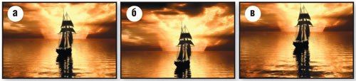 Покажем, как работает правило золотого сечения, на примере трёх фотографий парусника в море (рис.3а,б,в).