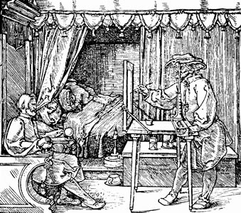 Слово «перспектива» в переводе с латинского означает «ясно вижу». В изобразительном искусстве линейная перспектива — это изображение предметов на плоскости в соответствии с кажущимися изменениями их величины. Основу современной теории перспективы заложили великие художники эпохи Возрождения — Леонардо да Винчи, Альбрехт Дюрер и другие. На одной из гравюр Дюрера (рис. 7) изображён способ рисования с натуры через стекло с нанесённой на него квадратной сеткой. Этот процесс можно описать так: если встать перед окном и, не изменяя точки зрения, обвести на стекле всё, что видно за ним, то полученный рисунок и будет перспективным изображением пространства.