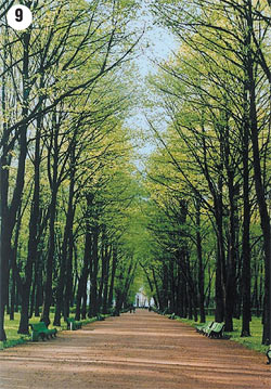 Иллюзия глубины в плоских изображениях может быть достигнута и при помощи параллельных прямых, уходящих вдаль, — это, например, дорога или парковая аллея (фото 9). Параллельные в действительности стороны аллеи по мере удаления кажутся сходящимися в одной точке у горизонта. Это происходит из-за визуального уменьшения ширины аллеи по мере её удаления.