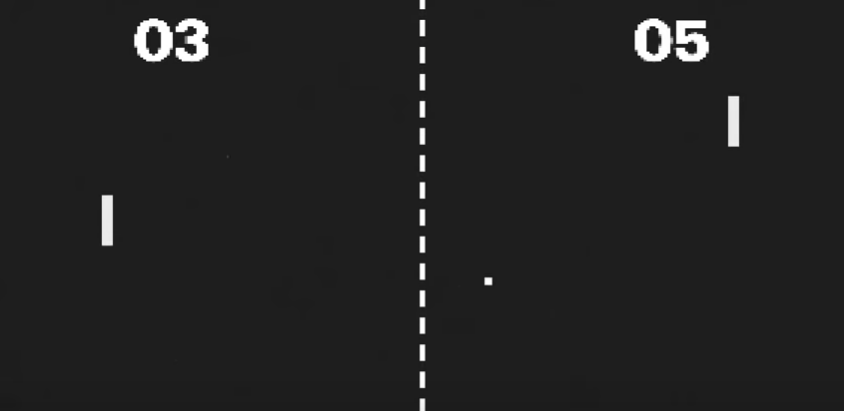 Еще 47 лет назад максимально реалистичной компьютерной игрой был Pong разработки Atari. Цифровой пинг-понг: два прямоугольника и точка, которая летает между ними. Вот как это выглядело ( черный и белый точно не были такими насыщенными).