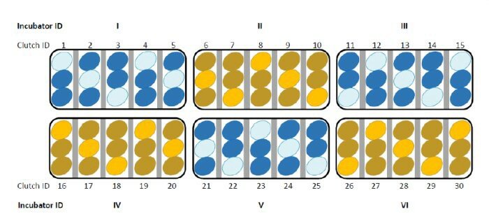 Яйца разделили на шесть групп: три экспериментальных желтых и три контрольных синих. Четыре раза в день ученые брали два яйца из каждого ряда (всегда одни и те же, отмечены более темным цветом) и клали их в звуконепроницаемую коробку, где желтым проигрывали голоса взрослых чаек с сигналами тревоги. Синие отлеживались в тишине.