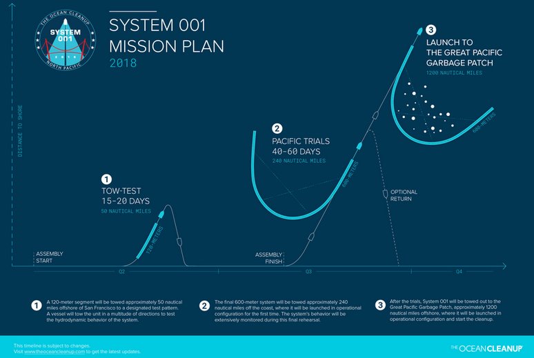 8 сентября 2018 года компания спустила на воду первый барьер, затем — целый флот из 60 аппаратов. Предполагается, что всего за пять лет таким образом удастся удалить из океана до 50% отходов, а к 2040 году — 90%. В будущем The Ocean Cleanup наладит сотрудничество с другими компаниями, которые будут перерабатывать пластик и производить из него новые продукты.