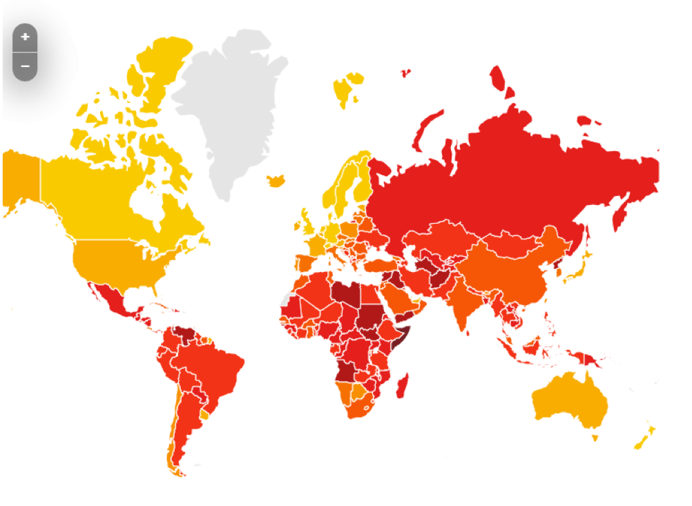 Щорічно Transparency International публікує данні щодо індексу протидії корупції (див. мал.). Найменш корумпованими є Нова Зеландія, Данія, Фінляндія, Норвегія, Швейцарія, Сінгапур, Швеція, Канада, Люксембург, Нідерланди та Великобританія. Навіть дотичний огляд без корупційних країн (на 100% корупцію не подолав ніхто) можна помітити що це найбільш заможні демократичні країни. України демонструє позитивну динаміку (тобто рух до менш корумпованої країни), хоча за загальними оцінками поки що має 32 бала зі 100. Показовим є факт, що 2/3 країн мають індекс нижчий за 50, а «середнє значення» індекс лише 43, тобто світ ще не наблизився до подолання корупції. Більш того глобалізація і відкритість кордонів іноді створюють можливості до експорту не тільки товарів і послуг, але й корупції, як однієї з практик ведення бізнесу.