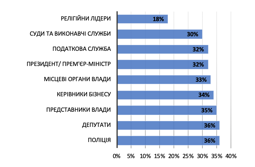 Показовим є те, що у 2019 р. (результати соціологічного опитування Фонду “Демократичні ініціативи”) 25% населення назвали хабарництво нормою життя. Більшість корупційних схем за опитуванням були у медичних закладах, дещо менше у ЗВО, місцевих органах влади, школах та у взаєминах із патрульною поліцією.