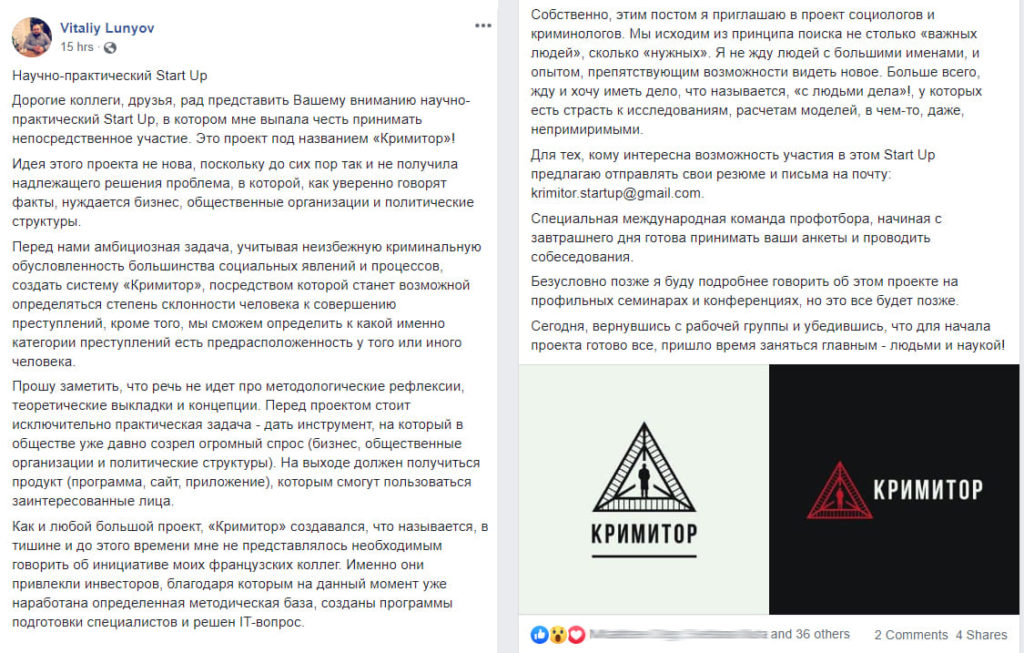 Дорогие коллеги, друзья, рад представить Вашему вниманию научно-практический Start Up, в котором мне выпала честь принимать непосредственное участие. Это проект под названием «Кримитор»!