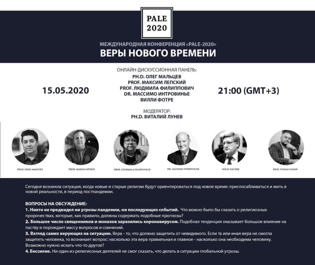 Международная конференция PALE-2020 «Жизнь в эру пост-апокалипсиса» стартует 22 мая. В ней примут участие 20 учёных с мировым именем из 9 стран, в том числе украинские учёные. Вчера прошла первая онлайн — дискуссионная панель, на которой обсуждалась тема «Веры нового времени». В дискуссии приняли участие доктор Массимо Интровинье (Италия), профессор Вилли Фотре (Бельгия), профессор Людмила Филиппович, профессор Максим Лепский и доктор философии Олег Мальцев. Модерировал дискуссию доктор философии Виталий Лунёв. «Гранит науки», как медиапартнер конференции, предлагает вниманию читателей репортаж с первого дня её работы.