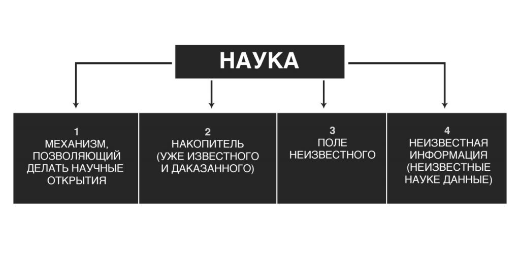 Давайте представим науку как неких 4 взаимодействующих блока: 1. Механизмы, позволяющие совершать научные открытия; 2. Блок уже известных знаний, который мы условно назовём «накопитель»; 3. Самое настоящее «Поле неизвестного» — что ещё предстоит исследовать, та среда, которая жаждет быть открытой и изученной; 4. Неизвестные науке данные.
