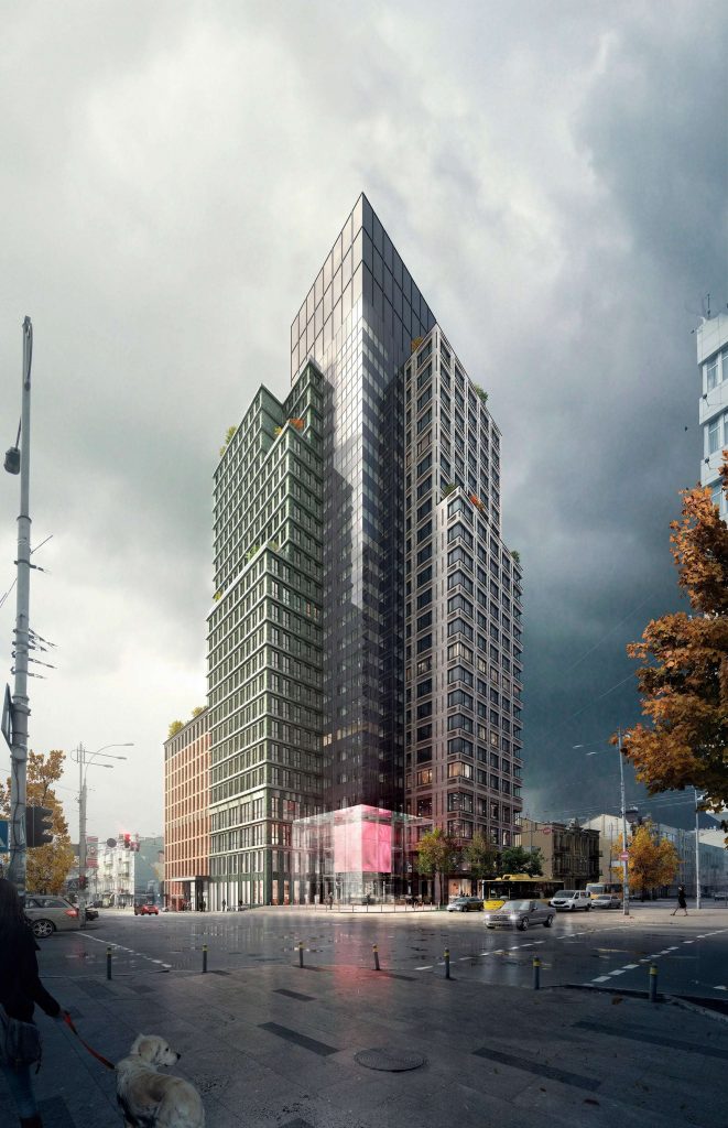 Строительство БЦ по разным причинам растянулось аж на 10 лет: с 2003 по 2013 год. Реализовывала его компания «Три О», принадлежащая Виктору Полищуку, которого зачисляют в члены «семьи» экс-президента Украины Виктора Януковича, а его жена приходится племянницей Светлане Медведевой – супруге российского премьера. Впрочем, вся эта информация не мешает огромному количеству иностранных компаний первого эшелона иметь офисы в небоскрёбе возле Дворца Спорта. Также господин Полищук владеет в Украине торговыми сетями электроники «Технополис» и «Эльдорадо», реклама которых регулярно подсвечивает зеркальную поверхность БЦ.