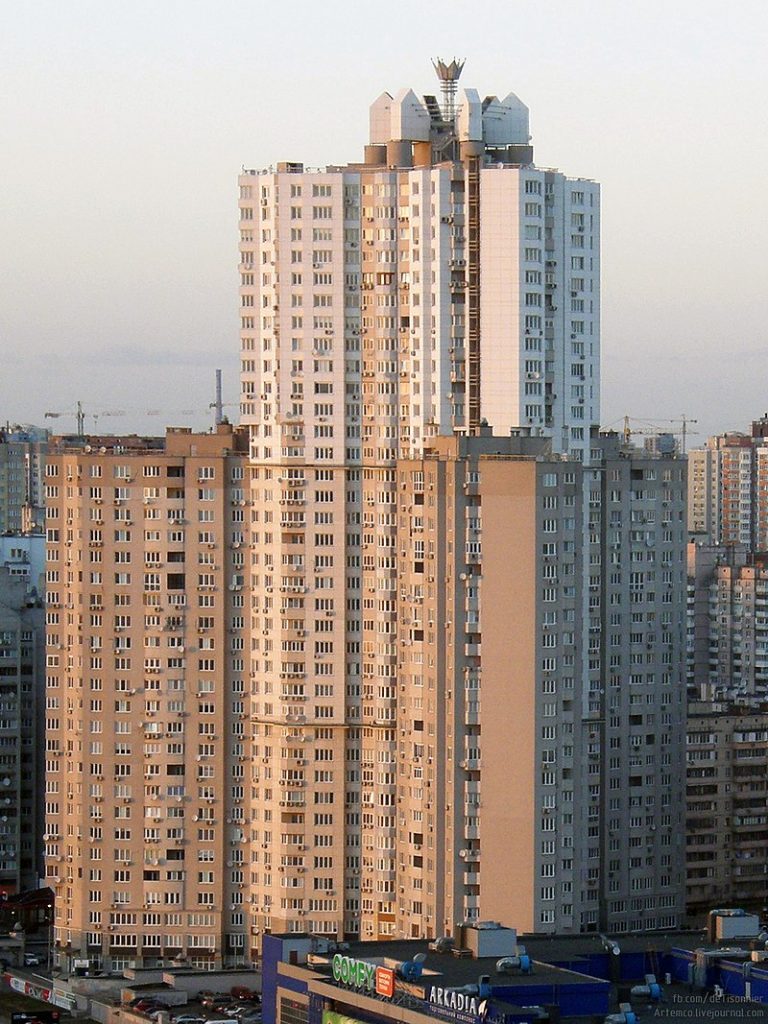 Жилой комплекс 8-этажным переходом сопряжён с 18-этажным офисным центром. На каком-то этапе строительства небоскрёб требовала снести даже международная организация ЮНЕСКО, под официальным предлогом, что башня портит вид на Киево-Печерскую Лавру. Однако творение компании «Жилстрой» и по сей день на месте, плотно заселено и, возможно, теми же работниками международных организаций, офисы которых в данном районе представлены в избытке.