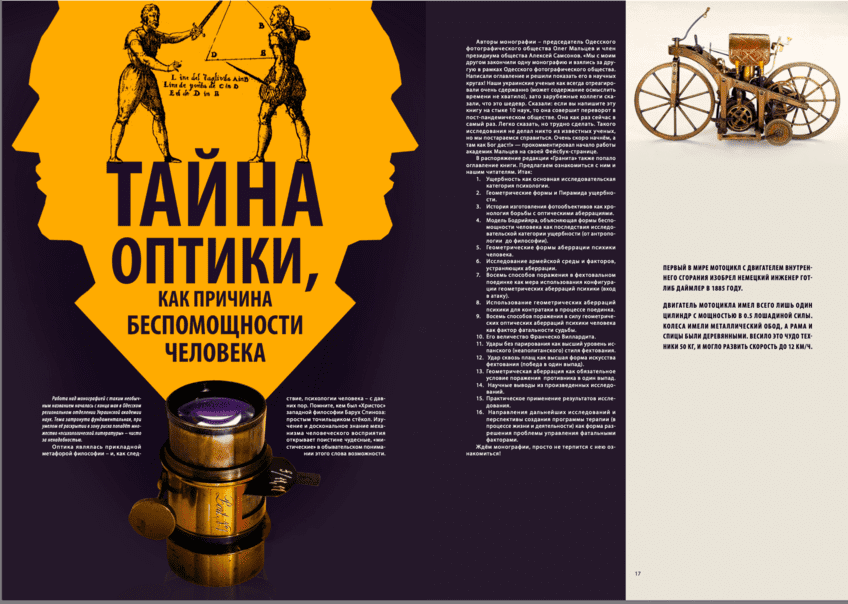 Чтобы углубиться в тему сокращения дистанции путём настройки внутреннего телескопа (или микроскопа, в общем, просто «объектива»), читайте книгу О.В. Мальцева «Тайна оптики как причина беспомощности человека» — а пока она не вышла, мы даём подробный анонс её содержания в номере «Гранита науки». Кроме того, крайне рекомендуем в этом аспекте изучить статью нашего гейдельбергского друга Вернера Гиссельманна с классификацией установок, сковывающих взгляд учёного.