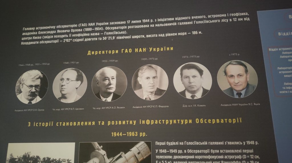Для тех, кто хотел бы подробнее ознакомиться с деятельностью Голосеевской обсерватории, в 2004 году, к 60-летию научного учреждения, был создан музей истории ГАО НАН Украины. В его экспозиции, любовно хранимой заведующим Иваном Павловичем Крячко, отражены страницы основания и развития обсерватории, выставлены первые телескопы, а отдельные стенды посвящены выдающимся сотрудникам. Собственно, «невыдающихся» в ГАО-то и нет!