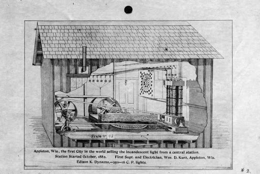 30 сентября 1882 года в американском городке Эпплтон (штат Висконсин) на реке Фокс заработала первая в мире гидроэлектростанция Vulcan Street, раздающая электричество множеству потребителей (по системе Эдисона). Динамо-машина, приводимая в движение водяным колесом, вырабатывала мощность 12,5 кВт. Построенная владельцем бумажной фабрики Роджерсом, она могла освещать его дом, фабрику и соседние строения.