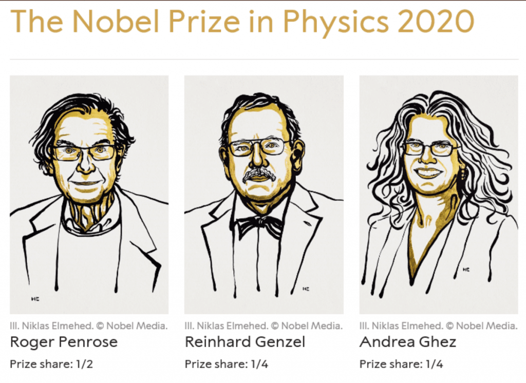 Шведская королевская академия наук объявила лауреатов Нобелевской премии по физике. В 2020 году ими стали Роджер Пенроуз (Roger Penrose) – «за открытие формирования чёрных дыр в рамках Общей теории относительности», а также Райнхард Генцель (Reinhard Genzel) и Андреа Гез (Andrea Ghez) «за открытие сверхмассивного компактного объекта в центре нашей галактики».