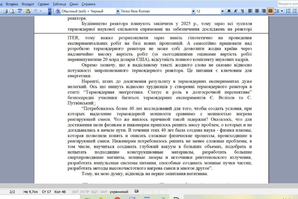 «Будівництво реактора {ITER} планують закінчити у 2025 р., тому зараз всі зусилля термоядерної наукової спільноти спрямовані на забезпечення досліджень на реакторі ITER, тому важко розраховувати зараз навіть гіпотетично на проведення експериментальних робіт на базі нових пропозицій. А самостійно працювати над розробкою термоядерного реактора не може собі дозволити жодна країна через надзвичайно високу вартість робіт (за сьогоднішніми оцінками вартість робіт перевищуватиме 20 млрд доларів США), відсутність повного комплекту наукових кадрів.