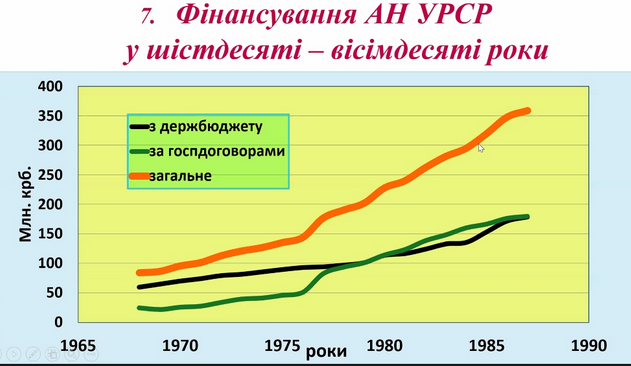 Может возникнуть впечатление, что фундаментальная наука была при этом на заднем плане и ей никакого внимания не уделялось. Но сегодня мы отмечаем 50-летие радиотелескопа УТР-2, созданного как раз в те годы – наибольшего радиотелескопа в мире, который стал основой системы «Уран», которая позволяет даже заглянуть в далёкий космос. В 60-е годы было завершено строительство и изохронного циклотрона У-240, который и сейчас понемногу работает. Некоторое время назад я ходил с сыном на экскурсию в родной Институт ядерных исследований, и там сказали: наш циклотрон был самым большим в Московском районе Киева потребителем электроэнергии. Я спросил: а сейчас? «А сейчас мы редко работаем»… Также к приобретениям Академии того времени относятся корабль науки «Михаил Ломоносов», буровое судно химикам для исследований моря, корабль «Академик Вернадский»…