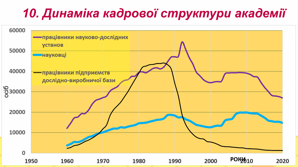 Ну и, конечно, изменилась кадровая структура Академии. Число работников Академии росло за счёт опытно-производственных баз, и если на протяжении 1960-1985 годов численность учёных в академических институтах выросла в 4,3 раза, то количество работников предприятий опытно-производственной базы – в 196 раз!