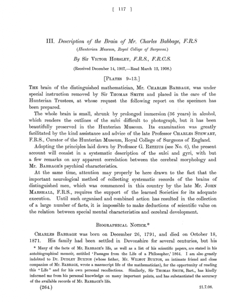 «Описание мозга мистера Чарльза Бэббиджа, ФРС», В. Хорсли в » Философских трудах» Лондонского королевского общества. Серия B, Содержащие статьи биологического характера (1896-1934) ; 1909; Лондонское королевское общество.