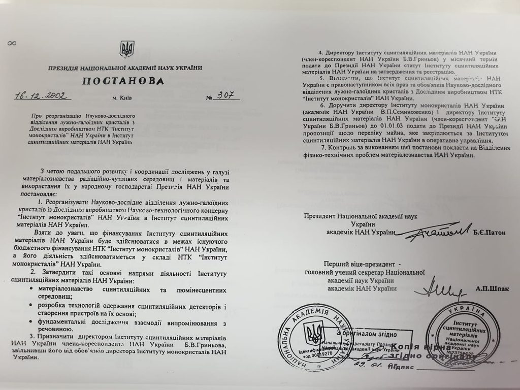 — Мы работаем в составе Научно-технологического комплекса «Институт монокристаллов». Он обслуживал весь Союз. Мы были отраслевым НИИ Минхимпрома, который курировал 18 предприятий на территории всей страны; краски, детекторы, продукция для обороны – всё шло только по постановлениям Совмина и ЦК КПСС. При огромной очереди заказчиков, институт был засекречен, адреса его – в центре Харькова — никто не знал. Проходная, колючая проволока и один телефон для междугородних звонков. А когда упал «занавес», мы стали интересны для всего мира. Мой коллектив никогда не работал на неполной рабочей неделе. В 1996 году мы выиграли два тендера, Японии и США (Стэнфордский университет), на создание больших установок для эксперимента по физике высоких энергий. За который, кстати, в 2008 году была присуждена Нобелевская премия!