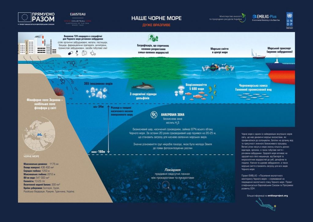 Антропогенное влияние на экосистему Чёрного моря определяется теми же характеристиками, которые определяют его природу. Помним: огромный речной сток, в 5 раз превышающий площадь самого моря, и узенький пролив, который соединяет Чёрное море с мировым океаном. То есть, с очень большой площади поверхности собирается весь мусор, все загрязнители, сносятся речным стоком в относительно небольшое Чёрное море – и дальше оттуда попасть уже никуда не могут: просто не пройдёт через узкий Босфор. Так что экологически Чёрное море впятеро уязвимее, чем в среднем мировой океан.