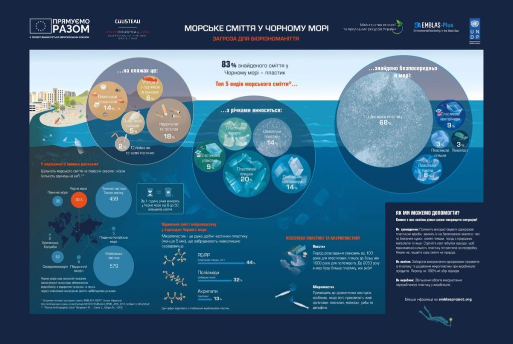Но вместо того появился другой загрязнитель, уже не нефть, а производное от нефти: разные виды пластика. На сегодняшний день «убийцей морей» является именно пластик. В чём суть проблемы? Мы пользуемся в быту огромным количеством пластика, а в воде он практически не разлагается. Точнее, разлагается, но за период от 400 до 800 лет… Сколько весенние паводки выносят из Карпат в сторону моря – это выглядит просто как ледоход! Миллионы пластиковых бутылок, упаковок биологически не распадаются, они дробятся на мелкие фракции, пока не достигают размера микропластика. Его не видим не только мы, его не способны отличать от микроводорослей жители моря – ну, они не эволюционировали миллионы лет в соседстве с пластиком, у них нету механизма, как отличить кусок пластика от такого же размера съедобной водоросли или бактерии. И таким образом, планктон начинает гибнуть от голода посреди очень сытных, кормных вод, потому что весь его желудок вместо еды забит микропластиком. А соответственно, гибнет планктон – гибнут все, кто им питается, и так утрачивается вся пищевая цепочка.