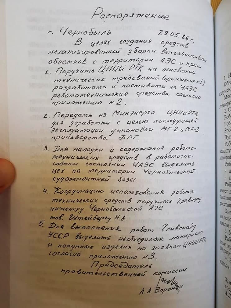 Немецкие роботы-манипуляторы, спешно закупленные правительством, MF-2 и MF-3, оба не выдержали излучения, потому что создавались не для работы на АЭС. Тогда к работе было решено привлечь главный в СССР центр робототехники. Он получил задание: до 15 июня 1986 года разработать и поставить на ЧАЭС подходящие для тушения пожаров, разведки и разгребания завалов машины. Из-за спешки распоряжение председателя правительственной комиссии Льва Воронина, датированное 29 мая 1986, было написано от руки.