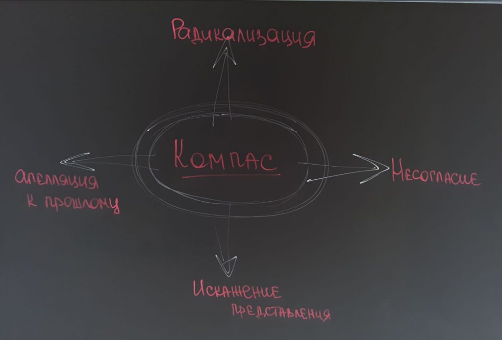 В центре — некое среднестатистическое равновесие. Стрелка вверх – радикализация: любая идея может быть радикализирована. Есть уловки субкультур, которые «обрезают» радикальную структуру, утверждая, что ее нет. Но радикалы — это герои, а ни одна организация без героев существовать не может.