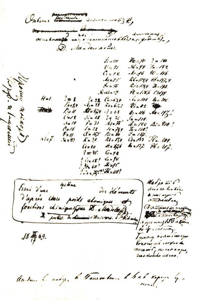 Через год, 17 февраля (1 марта) 1869 г., ученый сдал в набор рукопись «Опыт системы элементов, основанной на их атомном весе и химическом сходстве» — первый вариант «Периодической таблицы элементов».Но окончательная формулировка Периодического закона — фундаментального закона природы была дана ученым только в июле 1871 г.
