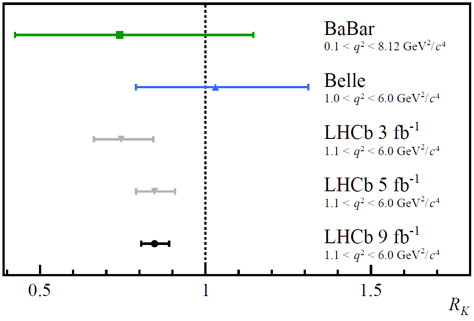 Согласно стандартной модели, они идентичны во всем кроме массы и вероятность появления в распадах обеих частиц одинакова. Иными словами, на каждые 100 случаев возникновения электронов должно приходиться такое же количество случаев возникновения мюонов. Однако физики увидели иную картину. При распаде B+-мезона в К-мезон электроны образовывались чаще, чем мюоны. На каждые 100 случаев возникновения первых приходилось 85 случаев возникновения вторых.