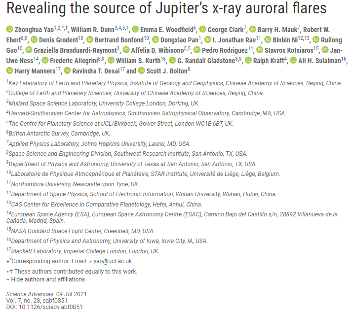 Здесь в статье коллектив авторов сообщил об одновременных наблюдениях на спутниках и с помощью космических телескопов, которые показывают процессы, вызывающие рентгеновские вспышки Юпитера, демонстрируя удивительное сходство с полярными сияниями земных ионов. Электромагнитные волны планетарного масштаба модулируют электромагнитные ионные циклотронные волны, периодически вызывая осаждение тяжелых ионов и генерирование рентгеновских импульсов Юпитера. Результаты показывают, что ионные сияния имеют общие механизмы в планетных системах, несмотря на то что временные, пространственные и энергетические масштабы меняются на порядки.