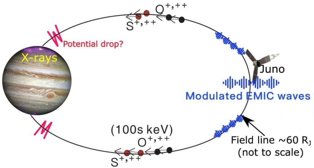 На Земле взаимодействия между ЭМИЦ-волнами и ионамигенерируют протонное сияние Земли (32). Известно, что в рентгеновском сиянии Юпитера преобладает излучениеионов, которые сталкиваются с нейтральной атмосферойЮпитера и посредством перезарядки генерируютспектральные линии, характерные для высыпающихсятяжелых ионов (1, 2, 33). Было обнаружено, что комбинацияионов кислорода и серы отлично подходит для наблюдаемых рентгеновских авроральных спектров (2, 33, 34). На рисунке S3 показано, что это так для полярныхсияний в этом интервале. Мы предполагаем, чтоупорядочение рисунка 1 от A, B и F до G, таким образом, обеспечивает цепочку причинно-следственных связей, которая приводит к генерации рентгеновских сияний: волнысжатия вызывают ионную анизотропию, которая производитквазипериодические волны EMIC, которые далеенаправляют атмосферные осадки высокоэнергетическихионов серы и кислорода вдоль магнитных полейпосредством процесса диффузии под углом наклона для генерации наблюдаемых рентгеновских авроральныхимпульсов. На рис. 2 схематически показано взаимодействие между волнами сверхнизкой частоты(УНЧ), ЭМИЦ-волнами и тяжелыми ионами в плазменномслое, которые приводят к осаждению тяжелых ионов в ионосферу и возникновению мягкого рентгеновскогоизлучения.