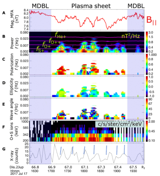 (A) Juno MAG измерения продольного магнитного компонента (B∥) в средних продольных координатах (координаты, полученные в 60-минутном окне). (B) Спектральная плотность мощности возмущений магнитного поля с наложением гироскопических частот различных зарядовых состояний ионов (He +, O ++, O + и S +). (C) Степень поляризации волн. (D) Эллиптичность волны. (E) Нормальный угол волны. (F) Juno JEDI измерения энергии и интенсивности серы и кислорода. (G) Кривые блеска XMM EPIC-pn и MOS (с разрешением 4 мин) северного рентгеновского сияния, которое наблюдалось в это время. Кривая блеска в рентгеновских лучах была сдвинута, чтобы учесть время прохождения света от Юпитера до XMM. Синие пунктирные линии показывают времена волн ЭМИЦ. Ожидается, что время, необходимое для осаждения вдоль силовых линий магнитного поля от внешней магнитосферы, составит десятки минут или более, так что невозможно напрямую связать одиночную EMIC-волну с рентгеновским импульсом; однако оба они демонстрируют схожую квазипериодичность.