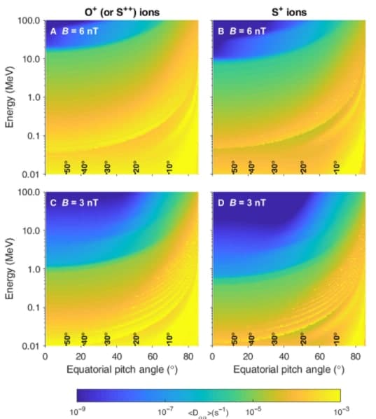 Важно отметить, что во время этих наблюдений космический аппарат Juno находился относительно далеко от центрального плазменного слоя, о чем свидетельствует большая магнитная компонента B∥ (~ 8 нТл) по сравнению сцентральным плазменным слоем (~ 1–4 нТл). Присохранении первого адиабатического инварианта частицы, измеренные Juno, будут иметь питч-углы <45 ° на магнитном экваторе. Наблюдаемые тяжелые ионы с относительно небольшими экваториальными питч-углами, вероятно, были следствием взаимодействий волна-частица, которое рассеивало их на меньшие питч-углы и заставляло их перемещаться на более высокие широты от центрального плазменного слоя. Коэффициенты диффузии по питч-углам на рис. 4 и рис. S5 подтверждают, что ионы могут подвергаться диффузионному процессу рассеяния от очень больших питч-углов вплоть до продольных питч-углов (то есть в конус потерь).