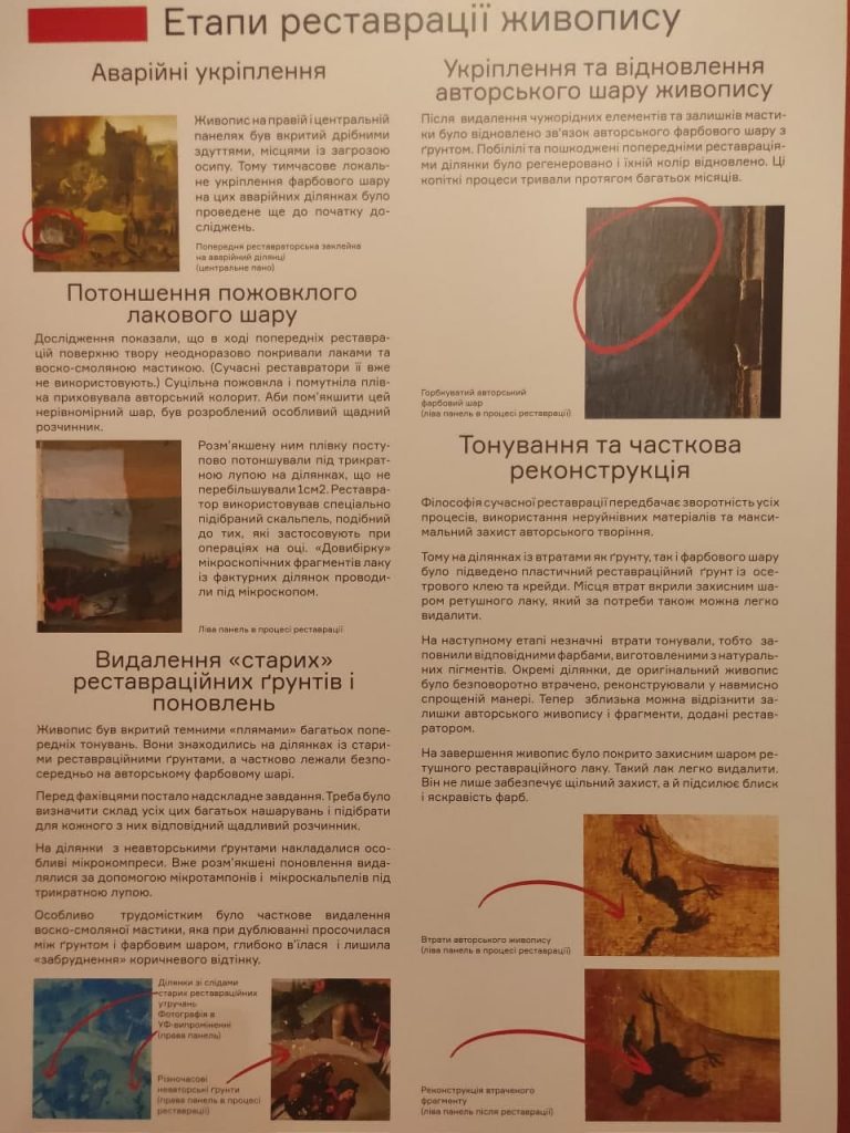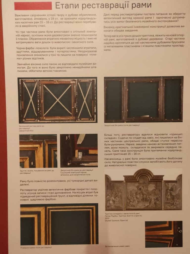 В-третьих, что триптих был основательно реставрирован в конце 19 – начале 20 века, вероятно в Германии. Скорее всего, необходимость этой реставрации и значительный масштаб реставрационных вмешательств были вызваны тем, что дубовая основа картины серьёзно пострадала от жуков-короедов и могла рассыпаться в прах. Именно поэтому реставраторы были вынуждены срезать красочный слой вместе с грунтом с левой и центральной дубовой панели и перенести их на новое полотно, которое потом наклеили на новую деревянную основу. Сегодня, когда бороться с жуками помогает химия, такая процедура уже не проводится и считается неоправданно травматической.