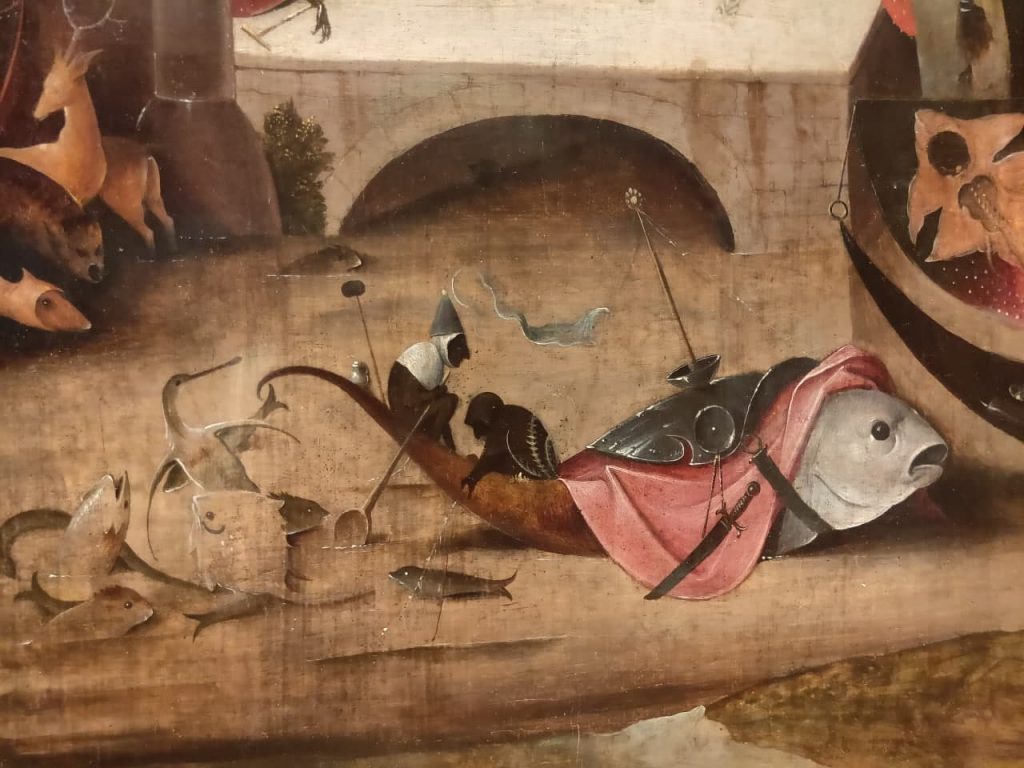 На левой панели действие происходит в пустыне, где демоны вытащили отшельника Антония (кстати, Антонием звали отца художника) из пещеры и подхватили в дьявольский полет, чтобы поколебать прочность его веры и силу духа. Ниже изображены