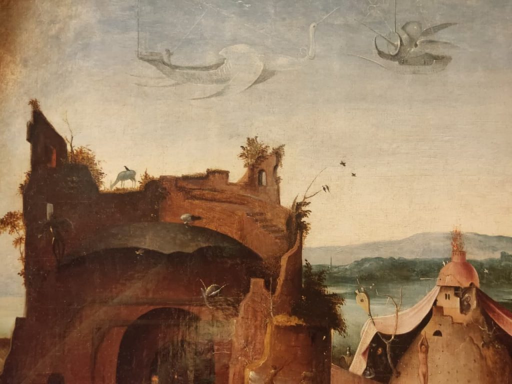 отшельника, которые спасают его после падения. Левая панель полна аллюзий на сцены соблазнения Христа дьяволом во время сорокадневного поста в пустыне.