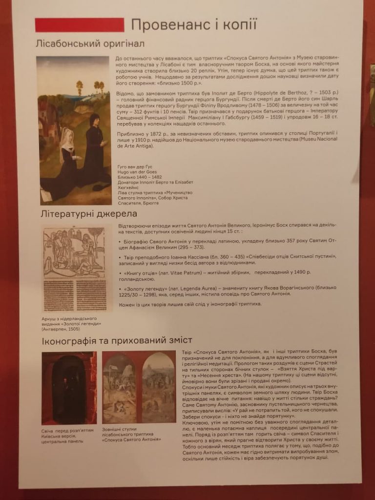 Триптих «Искушение святого Антония» был куплен Богданом Ханенко, собиравшим лучшие картины для будущего музея, как оригинальное произведение Босха, вероятно незадолго до 1911 года. Уже в 1927 году тогдашние сотрудники музея признали картину копией. «Кошмарная бессмыслица образов Босха окрашена элементами социальной сатиры», — вынужденно писали они в музейных аннотациях в 1930-е годы. И тем не менее, эту картину никогда не прятали от зрителя, она всегда была в экспозиции, хотя как-то загадочно и неравномерно «болела»: на двух створках триптиха появлялись вздутия красочного слоя, которые реставраторам приходилось постоянно укладывать.