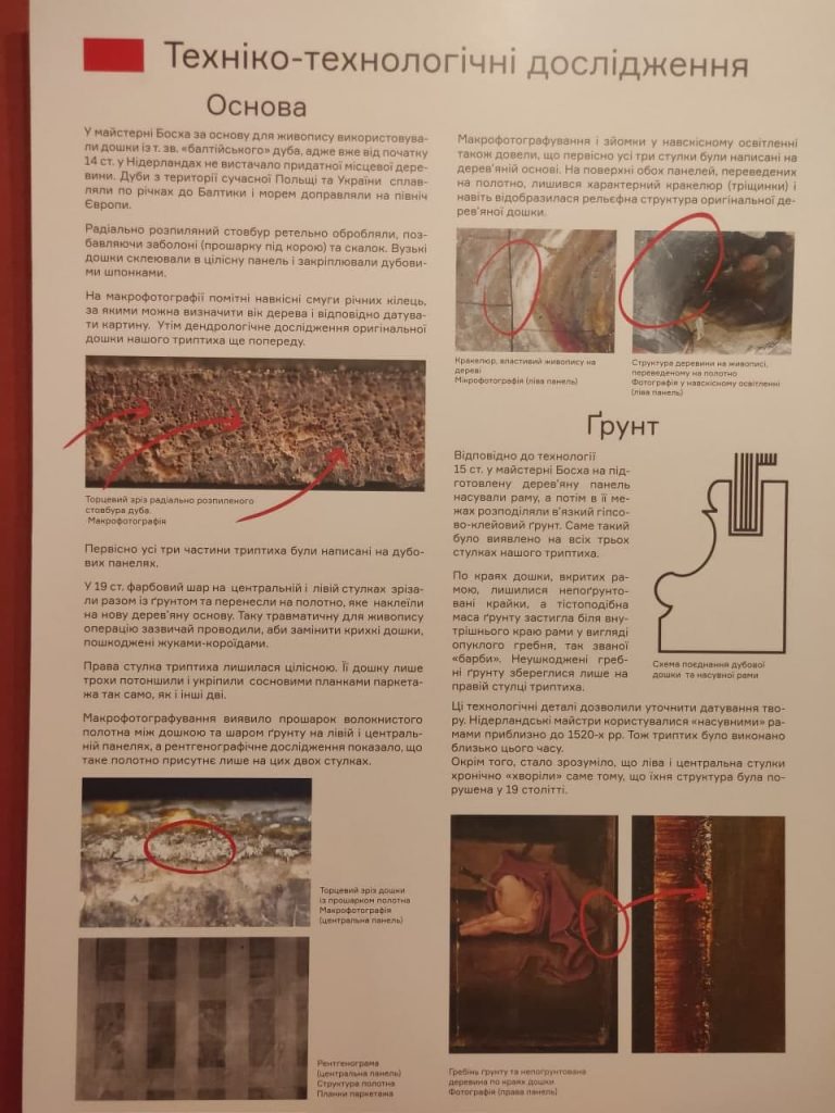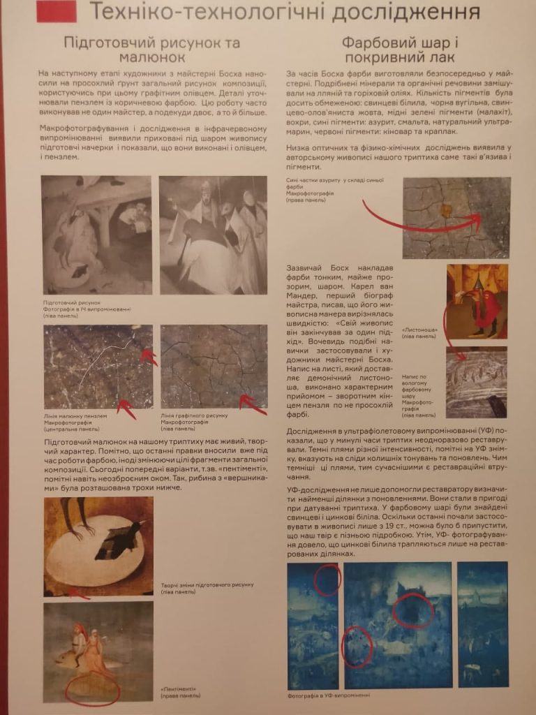 Мы также выяснили, что, скорее всего, триптих был создан сотрудниками художественной мастерской Босха приблизительно в 1520-е годы, вскоре после того, как прославленный мастер ушел из жизни. Об этом свидетельствуют технологические особенности нетронутой правой створки «Искушения», в частности, незагрунтованные края ее дубовой основы и утолщения (т.наз. «барбы») по периметру авторского грунта. И то, и другое говорит о том, что живопись наносилась в пределах заранее надвинутой на доску рамы, а такую технологию нидерландские мастера использовали приблизительно до 1520-х годов (Hélène Verougstraete. Frames and supports in 15th and 16th-century Southern Netherlandish painting. Initiative Royal Institute for Cultural Heritage: Brussels, 2015).