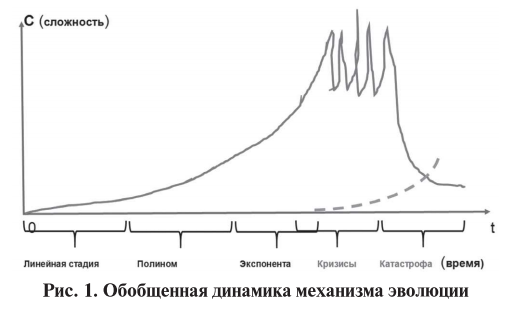 Поэсле этого система вступает в фазу экспоненциального роста сложности. Характерной особенностью экспоненциального периода является то, что он происходит на границе предельных возможностей развития системы. Данный период усложнения плохо поддается или уже совсем не поддается управлению, и в системе начинают нарастать критические явления. Их причиной является внутренняя противоречивость эволюционного процесса: Основной закон эволюции («Сложность эволюционирующей системы всегда растет») требует возрастания сложности, а необходимость обеспечения управляемости системы с такой же необходимостью ограничивает этот рост. Критические явления нарастают и могут стать для системы катастрофическими. В это время в недрах системы – а возможно, и вне их – происходит (если происходит!) зарождение нового механизма эволюции, с которым осуществляется примерно такая же история.