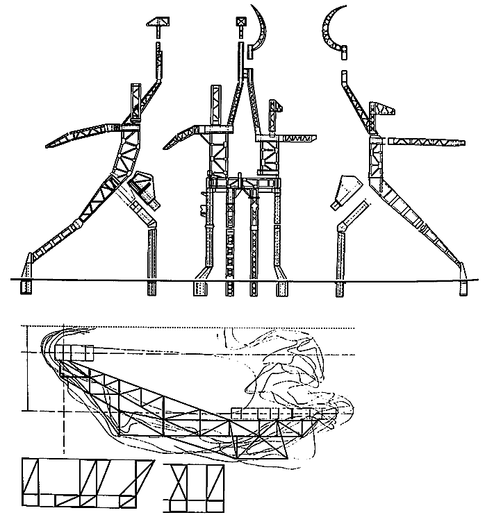 Оболочка навешивалась на основной каркас при помощи промежуточного каркаса, изготовленного из углового железа, и представляла собой ряд небольших ферм. Когда оболочка была обдута песком снаружи и изнутри, весь каркас был окрашен суриком. На оболочку ушло 8,5 т нержавеющей стали, а на промежуточный каркас около 15 т стали различных профилей.